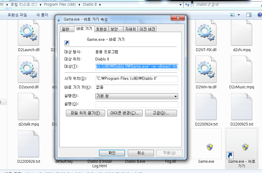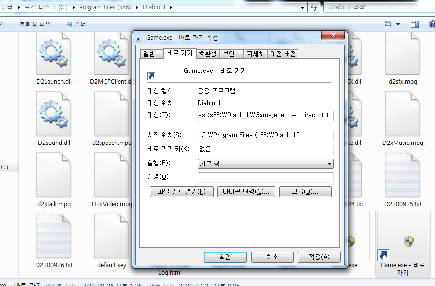 3. game.exe - 바로가기 파일을 선택해 마우스 오른쪽 버튼을 눌러 속성에서 아래와 같이